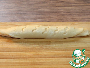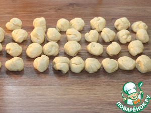 • 9. Разрезаем валики на 36 частей и округляем. Складываем заготовки на разделочную доску и накрываем салфеткой, чтобы тесто не обветрилось.