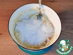 Перемешиваем массу до однородности. В жидкую массу всыпаем муку с маслом и перемешиваем.
