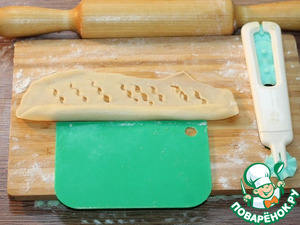 Подпыляем разделочную доску мукой и раскатываем кусочек теста в тонкую лепешку (тол. 1 мм).