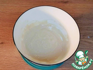 • 2. Приготовим опару. Вливаем в миску теплое молоко (80 мл). Всыпаем 1 ст. л. сахара, сухие дрожжи (5 г) и 3 ст. л. муки, перемешиваем и оставляем на 30 минут или до появления пеной шапочки.