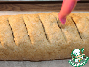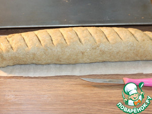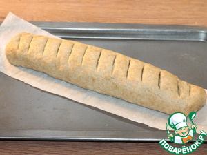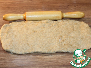 6. Смазываем столешницу растительным маслом и формируем из теста толстый прямоугольник 30*15 см. Скатываем прямоугольник в плотный рулет и защипываем край.