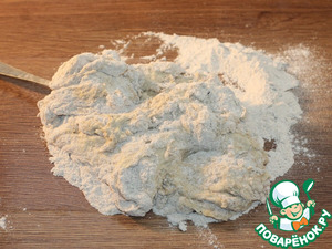 5. Подпыляем столешницу ржаной мукой и выкладываем тесто из миски. Вмешиваем остатки муки и собираем тесто в ком.