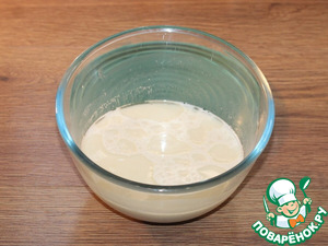 2. В большую миску вливаем теплый кефир (30 С) и всыпаем соду, хорошо перемешиваем. Затем всыпаем соль, добавляем мед (0,5-1 ст. л.), растительное масло (2 ст. л.) и взбиваем и взбиваем венчиком.