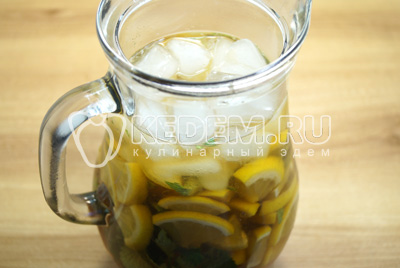 Добавить в кувшин с чаем кубики льда и перемешать.