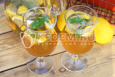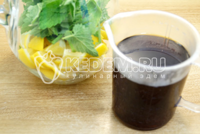 Добавить в кувшин с лимоном и мятой крепко заваренный черный чай.