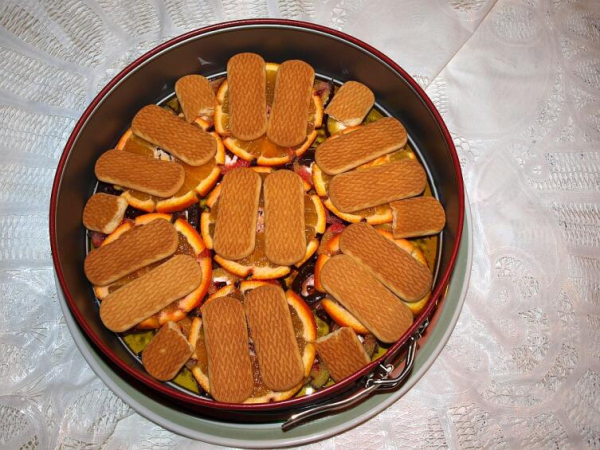 Песочное печенье, приобретенное или приготовленное заблаговременно, обмакивают в пиалу с холодным кофе на 1 секунду и выкладывают вторым слоем — на застывшую форму с апельсинами.
