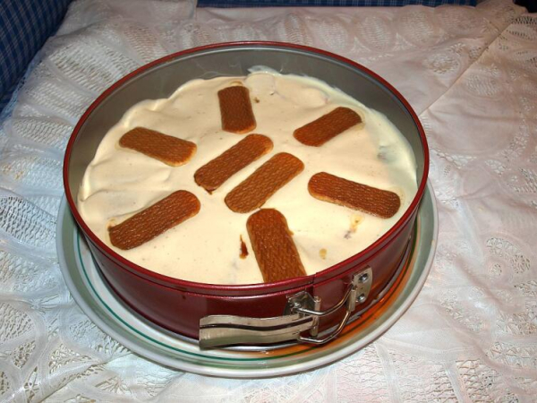 Получившуюся взбитую смесь в консистенции крема разделяют на две равные части. Одной из них покрывают всю форму сплошным слоем. Печенье обливают жидким шоколадом. Затем повторяют шаги с выкладыванием пропитанного печенья и обмазывания кремом еще раз.