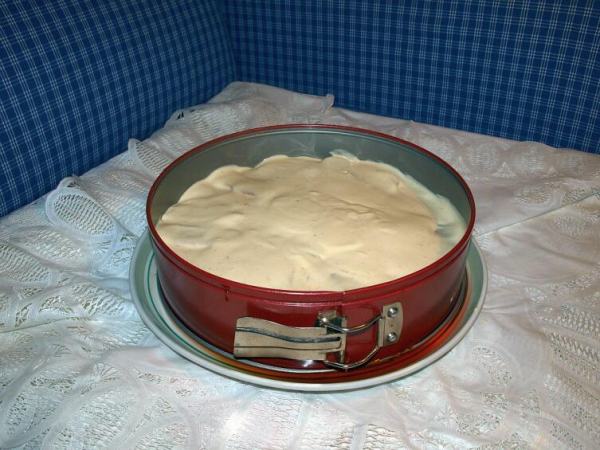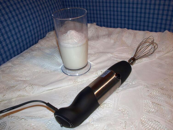 Для заливки холодное коровье молоко жирностью 3,2% (и выше) и сливки жирностью 22% смешиваем в мерной емкости для взбивания. Взбивают смесь электрическим блендером или венчиком — вручную. На усмотрение хозяйки можно добавить кофе и шоколад еще и сверху — на третий слой формы.