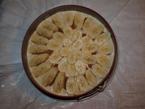 Затем два очищенных банана нарезают на равные ломтики овальной формы толщиной не более 0,5 см и выкладывают последним слоем.