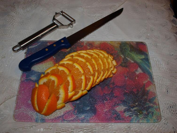 Затем обычным разделочным ножом нарезают апельсин на кружки толщиной не более 1 см.