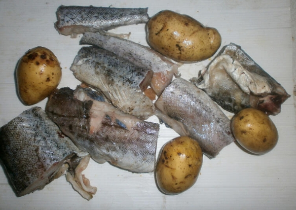 Примерно через 10 минут после начала отваривания рыбы добавляют очищенный картофель; его не обязательно даже разрезать на дольки.