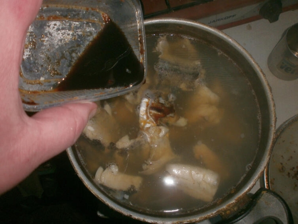 - На разделочную доску в процессе разделки рыбы насыпают молотый кофе и вручную обваливают куски рыбы в нем. Затем помещают в кипящую воду. По готовности суп отдает кофейными нотками и дает заряд энергии тем, кто его ест.