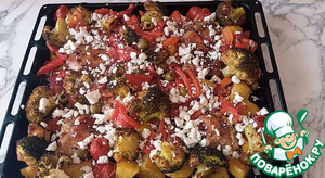 В той же миске смешайте брокколи, помидоры, оливки, лук, болгарский перец и оставшийся маринад. Через 25 достаньте противень из духовки, добавьте овощи и отправьте обратно в духовку, еще на 30-35 минут.