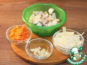 И нарезаем: грибы — дольками, лук — полукольцами, морковь — брусочками и мелко рубим чеснок.