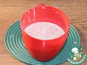 • 5. Приготовим заливку. В посуду, где была печень, вливаем теплое молоко (150 мл) и смываем мучные кусочки. Затем сливаем смесь в другую посуду. Добавляем сметану, томатный кетчуп (или пасту 1 ст. л.). Всыпаем специи и взбиваем венчиком. Специи у меня с добавлением пряных трав и сухих — чеснока и лука.
