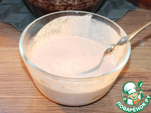 10. Приготовим простейший соус. Смешиваем в миске сметану с кетчупом (или пастой) и вливаем воду. Всыпаем по вкусу специи и перемешиваем.