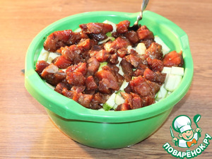 3. Выкладываем мясо в миску и заливаем соусом терияки,…