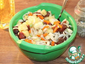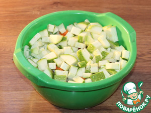 6… и нарезаем. Лук — полукольцами, морковь — брусочками, картофель и кабачок — кубиками, чеснок мелко рубим. Выложите овощи в миску.