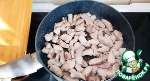 На сильном огне разогрейте растительное масло. Выложите мясо, посолите и поперчите его по вкусу. Обжарьте мясо до белого цвета. Примерно 3-4 минуты, периодически перемешивая. Обжаренное мясо уберите со сковороды.