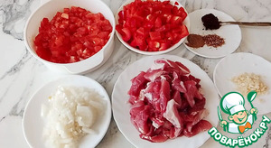 Подготовьте все ингредиенты. Мелко нарежьте помидоры, болгарский перец, лук и чеснок. Мясо нарежьте небольшими кусочками, как вам нравится.