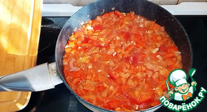После чего, добавьте помидоры и болгарский перец. Перемешайте. Тушите под крышкой, на слабом огне 20 минут.