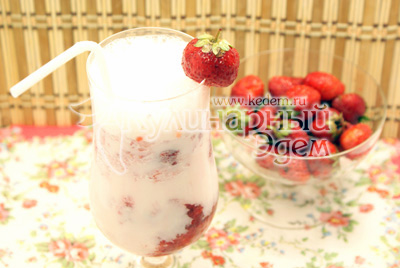 Залить молочной смесью. По желанию добавить пару кубиков льда. Украсить бокал клубникой.