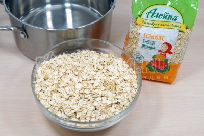 Чтобы приготовить овсяный кисель нужно отмерить в миску 500 грамм овсяных хлопьев Геркулес ТМ «Алейка», от щедрых полей Алтая.