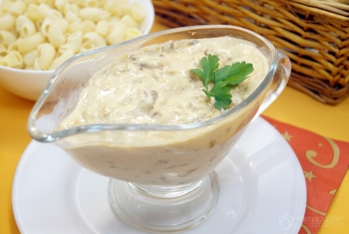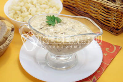 Соус из сухих грибов со сметаной готов. Выложить в соусник и подавать к столу.