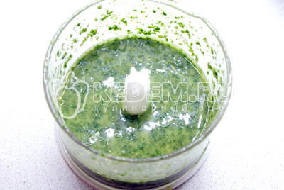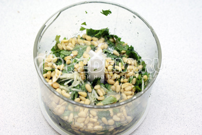 Чтобы приготовить соус песто с кинзой, кинзу нужно хорошо вымыть и обсушить, мелко порубить и сложить в чашу блендера вместе с остальными ингредиентами.