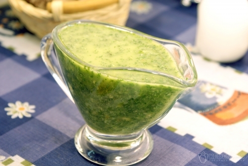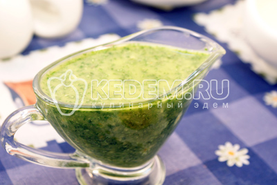 Соус песто с кинзой готов. Переложить в соусницу и подавать к макаронам, овощным или мясным блюдам.