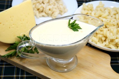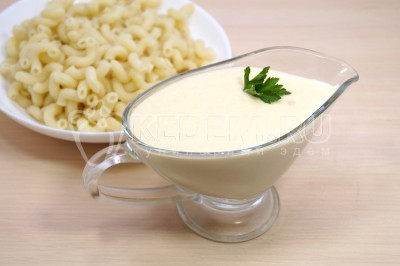 Перелить сырный соус для макарон в соусник.