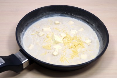 Добавить сыры в сковороду и, помешивая, растопить сыр в соусе.